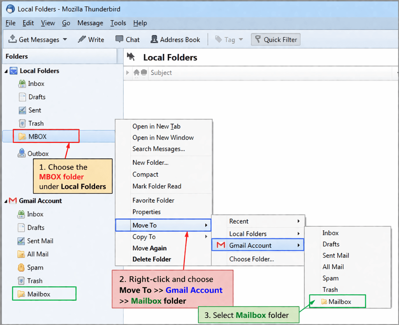 You can manually open MBOX files in Gmail using MBOX supported email client like Thunderbird. Follow the below given instructions to complete the importing process via Thunderbird: