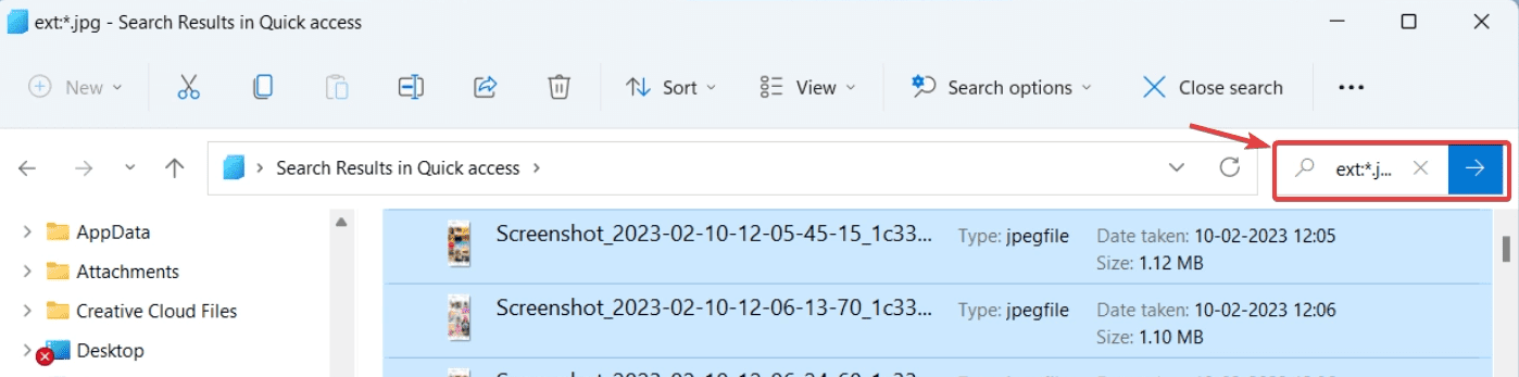 - Now go to the search bar of File Explorer and type ext:*.JPG and press ENTER.